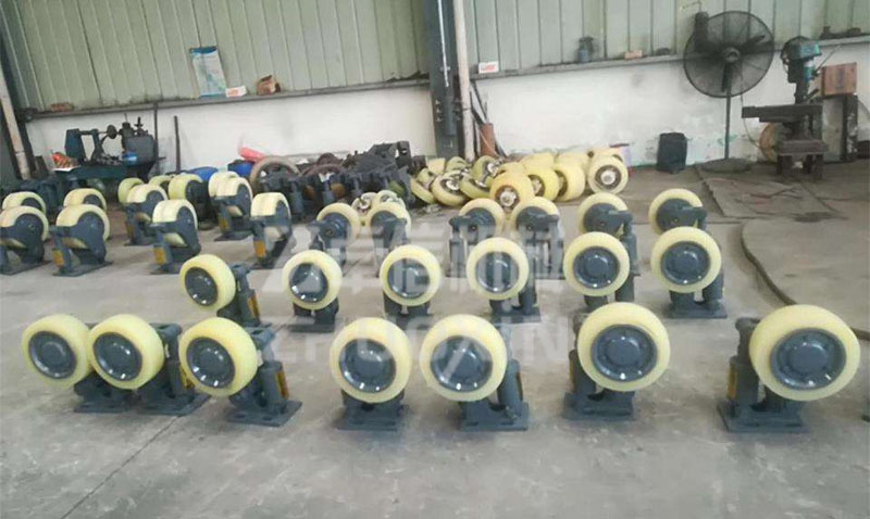 根據(jù)滾輪磨損情況,應(yīng)對滾輪進(jìn)行調(diào)整,方法是松開螺桿鎖緊螺母,轉(zhuǎn)動螺桿使?jié)L輪靠向罐道,間隙0~2mm,調(diào)好后緊固鎖緊螺母。