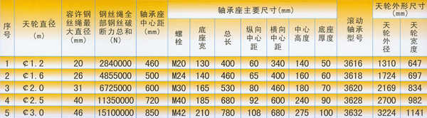 3)提升天輪采用繩輪與軸承座可調型式,使用時根據實際情況進行選用,還可根據情況,另行組合設計,可不受規(guī)定品種和可調型式的限制,但訂貨時應加以說明。