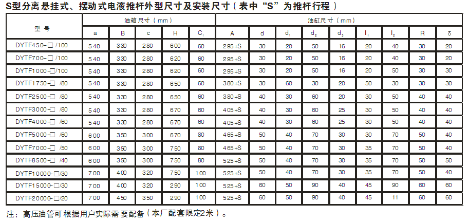 DTYF型分離式電液推桿優(yōu)點(diǎn):1.DTYF型分離式電液推桿具有過(guò)載自動(dòng)保護(hù)功能:電液推桿工作時(shí),如活塞桿所受外力超過(guò)額定的輸出力或活塞已到終點(diǎn),電機(jī)仍在轉(zhuǎn)動(dòng),這時(shí)油路中油壓增高到調(diào)定的壓力,溢流閥迅速而準(zhǔn)確地溢流,實(shí)現(xiàn)過(guò)載自動(dòng)保護(hù)。電機(jī)雖在轉(zhuǎn)動(dòng),但絕不會(huì)燒毀。自鎖功能:電液推桿的油路集成塊中設(shè)計(jì)了壓力自鎖機(jī)構(gòu),電機(jī)停止轉(zhuǎn)動(dòng),活塞桿立即停留在一定的位置上,壓力油處于保壓狀態(tài)。無(wú)級(jí)調(diào)節(jié):可根據(jù)用戶(hù)要求,在額定的速度、輸出力和行程范圍內(nèi)進(jìn)行無(wú)級(jí)調(diào)節(jié)。DTYF型分離式電液推桿在冶金、礦山、煤炭、電力、機(jī)械、糧食、水泥、化工、水利、運(yùn)輸?shù)刃袠I(yè),是不可缺少的通用動(dòng)力源,DTYF型分離式電液推桿概述:DYT、DYTB系列電液推桿可做往復(fù)推桿直線或往復(fù)旋轉(zhuǎn)一定角度的運(yùn)動(dòng),適用于上升、下降或夾緊工作物的場(chǎng)所,也適用于與遠(yuǎn)距離及高空危險(xiǎn)地區(qū),廣泛適用于冶金、礦山、煤炭、電力、機(jī)械、水泥、化工、水利、運(yùn)輸?shù)炔块T(mén)。電液推桿的工作條件:推桿應(yīng)在不含腐蝕性、不易燃易爆的介質(zhì)環(huán)境中使用。如遇有上述情況,推桿應(yīng)注明屬特殊規(guī)格。工作環(huán)境溫度:-35℃~60℃相對(duì)濕度:<95%無(wú)強(qiáng)烈震動(dòng)。滿(mǎn)負(fù)荷工作時(shí),不應(yīng)超出推拉力。海拔高度符合GB755規(guī)定。電液推桿訂貨須知DTYF型分離式電液推桿主要是由推桿的型式、電機(jī)的防護(hù)等級(jí)、額定輸出力、行程、額定速度和使用角度等六大基本要素組成,DTYF型分離式電液推桿還可根據(jù)擁護(hù)特殊要求,配套三種調(diào)節(jié)功能,即:速度調(diào)節(jié)推、拉力調(diào)節(jié),行程調(diào)節(jié)(行程開(kāi)關(guān)定位)。DTYF型分離式電液推桿工作原理:1、DTYF型分離式電液推桿以電動(dòng)機(jī)為動(dòng)力源,通過(guò)電動(dòng)機(jī)正(反)向旋轉(zhuǎn),使液壓油通過(guò)雙向齒輪泵輸出壓力油,經(jīng)油路集成塊,送至工作油缸,實(shí)現(xiàn)活塞桿的往復(fù)運(yùn)動(dòng)。2、過(guò)載自動(dòng)保護(hù)功能:電液推桿工作時(shí),如活塞桿所受外力超過(guò)額定的輸出力或活塞已到終點(diǎn),電機(jī)仍在轉(zhuǎn)動(dòng),這時(shí)油路中油壓增高到調(diào)定的壓力,溢流閥迅速而準(zhǔn)確地溢流,實(shí)現(xiàn)過(guò)載自動(dòng)保護(hù)。電機(jī)雖在轉(zhuǎn)動(dòng),但絕不會(huì)燒毀。3、自鎖功能:電液推桿的油路集成塊中設(shè)計(jì)了壓力自鎖機(jī)構(gòu),電機(jī)停止轉(zhuǎn)動(dòng),活塞桿立即停留在一定的位置上,壓力油處于保壓狀態(tài)。4、可根據(jù)用戶(hù)要求,在額定的速度范圍內(nèi)進(jìn)行無(wú)級(jí)調(diào)節(jié)速度。5、可根據(jù)用戶(hù)要求,在額定的輸出力范圍內(nèi)進(jìn)行無(wú)級(jí)調(diào)節(jié)推、拉力。6、可根據(jù)用戶(hù)要求,在額定的行程范圍內(nèi)進(jìn)行無(wú)級(jí)調(diào)節(jié)行程。DTYF型分離式電液推桿具有以下優(yōu)點(diǎn):1、安裝方便、維護(hù)簡(jiǎn)單。在安裝、使用過(guò)程中,24小時(shí)技術(shù)指導(dǎo)電話.2、采用了全液壓傳動(dòng)、能有效的緩沖外來(lái)的沖擊力,運(yùn)行中動(dòng)作靈敏、平穩(wěn),行程控制精準(zhǔn),誤差不會(huì)超過(guò)0.5mm。3、安全措施好,如操作中斷電,推桿就會(huì)自動(dòng)鎖閉,避免事故的發(fā)生。4、雙向鎖設(shè)置,可在規(guī)定范圍行程內(nèi)的任意位置自行鎖閉,且保持輸出力不變。5、推拉力、速度,可按需要要求設(shè)置,驅(qū)動(dòng)力范圍及其廣泛。6、可在惡劣的環(huán)境下使用,使用壽命長(zhǎng),內(nèi)部不會(huì)銹蝕、不會(huì)進(jìn)水、體積小、不滲油。DTYF型分離式電液推桿安裝使用時(shí)注意事項(xiàng)1.DTYF型分離式電液推桿安裝要有足夠的空間,環(huán)境溫度10-60度之間(高溫環(huán)境要特別訂貨)。2.用戶(hù)可根據(jù)控制需要配置行程開(kāi)關(guān)。3.電動(dòng)液壓推桿安裝前先平放在地上,注入液壓油(牌號(hào)HM.精度等級(jí)46-68)油位在觀察口下緣,分體推桿油面應(yīng)在離箱50mm以?xún)?nèi)。4.DYTZ、DYTP、DYTF在使用前應(yīng)旋松排氣孔的排氣螺絲2圈。5.安裝時(shí)要試開(kāi)機(jī)。a.整體推桿,接上電源即可運(yùn)行b.分體推桿,接上電源讓油缸在無(wú)負(fù)載情況下,往復(fù)動(dòng)作數(shù)次使油缸和油管中的空氣排出,在帶上負(fù)載電液推桿的維護(hù)1.為保證高壓油管的使用壽命,要用膠皮把油管固定好。2.使用液壓油要定期過(guò)濾或者更換,一年一次或根據(jù)實(shí)際工作自定周期。3.長(zhǎng)期閑置不用,仔投入使用前要對(duì)電機(jī)進(jìn)行絕緣檢查。4.簡(jiǎn)易故障排除a.剛安裝時(shí)不能動(dòng)作,查電機(jī)未運(yùn)行或油量不足。b.使用一段時(shí)間后不能動(dòng)作,拆下液控落塞,清洗液控閥閥芯,更換液壓油。使用長(zhǎng)時(shí)間后,推桿空載能夠推拉,帶負(fù)載不能攤位。更換油缸內(nèi)活塞上孔用密封件。密封面滲漏,更換